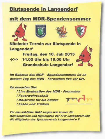 Am 10.07.2015 fand in Langendorf der große MDR Aderlass statt, bei dem über 150 Personen Blut spendeten. Wir bedanken uns für die rege Teilnahme!